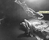 One image appears to show a piece of the wreckage with somebody climbing over the white, blue and red striped fuselage.